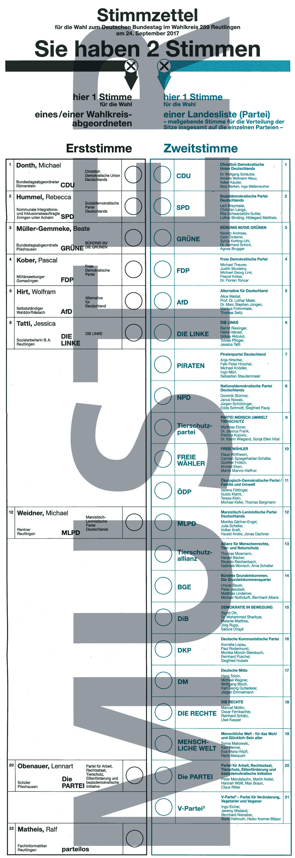 Bundestagswahl am 24. September 2017 von 8.00 bis 18.00 Uhr im Rathaus Wannweil, Hauptstr. 11