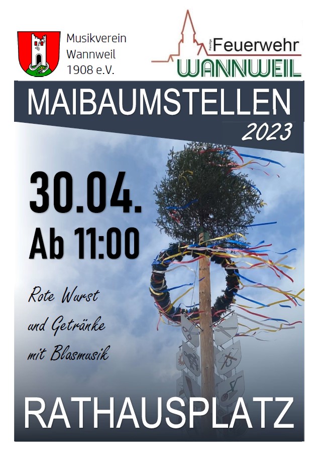 Der Maibaum wird am 30.04.2023 aufgestellt. Beginn ist um 11.00 Uhr auf dem Rathausplatz. Veranstalter sind der Musikverein und die Freiwillige Feuerwehr